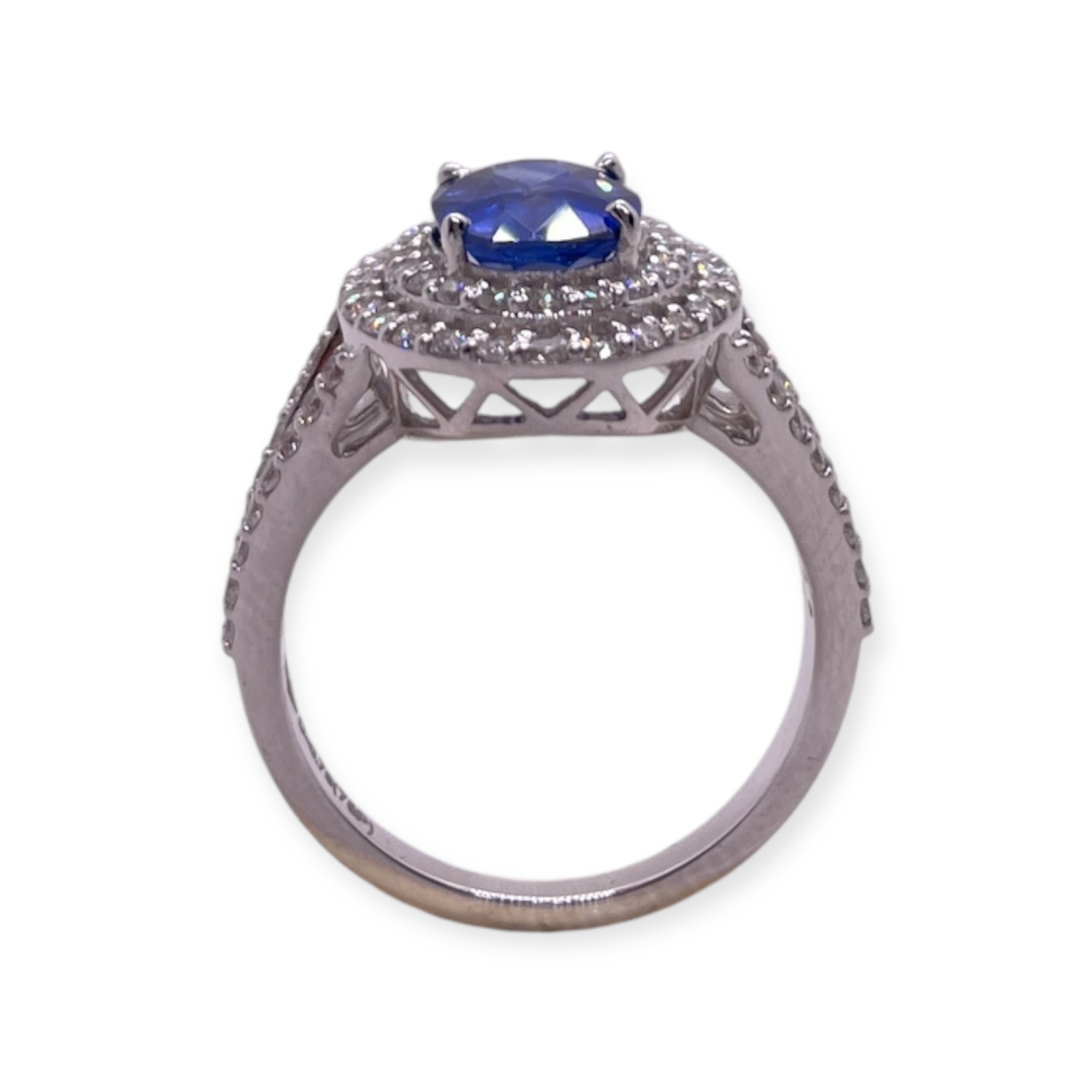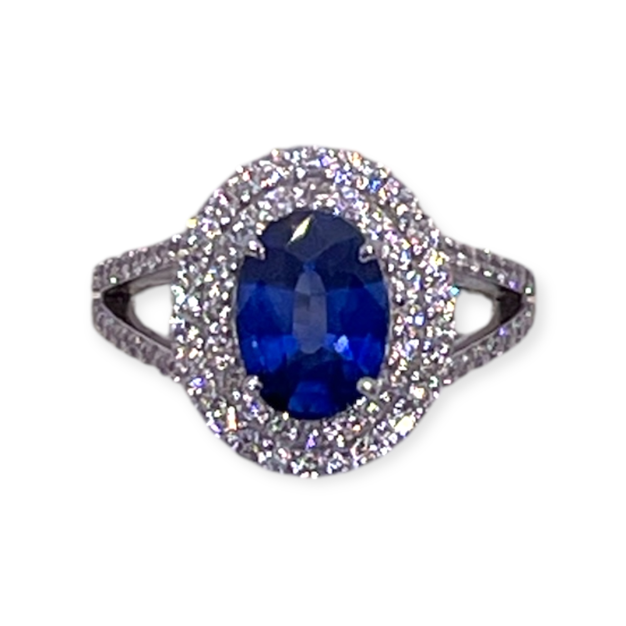 A beautiful natural oval cut sapphire set in 18kt white gold surrounded with double cluster of white diamonds.