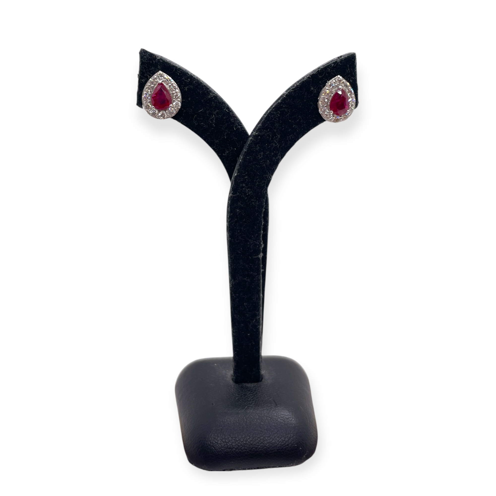 An elegant pair of pear/drop shape Mozambique Ruby studs setted in 18Kt white gold enclosed in a cluster of white natural diamonds.