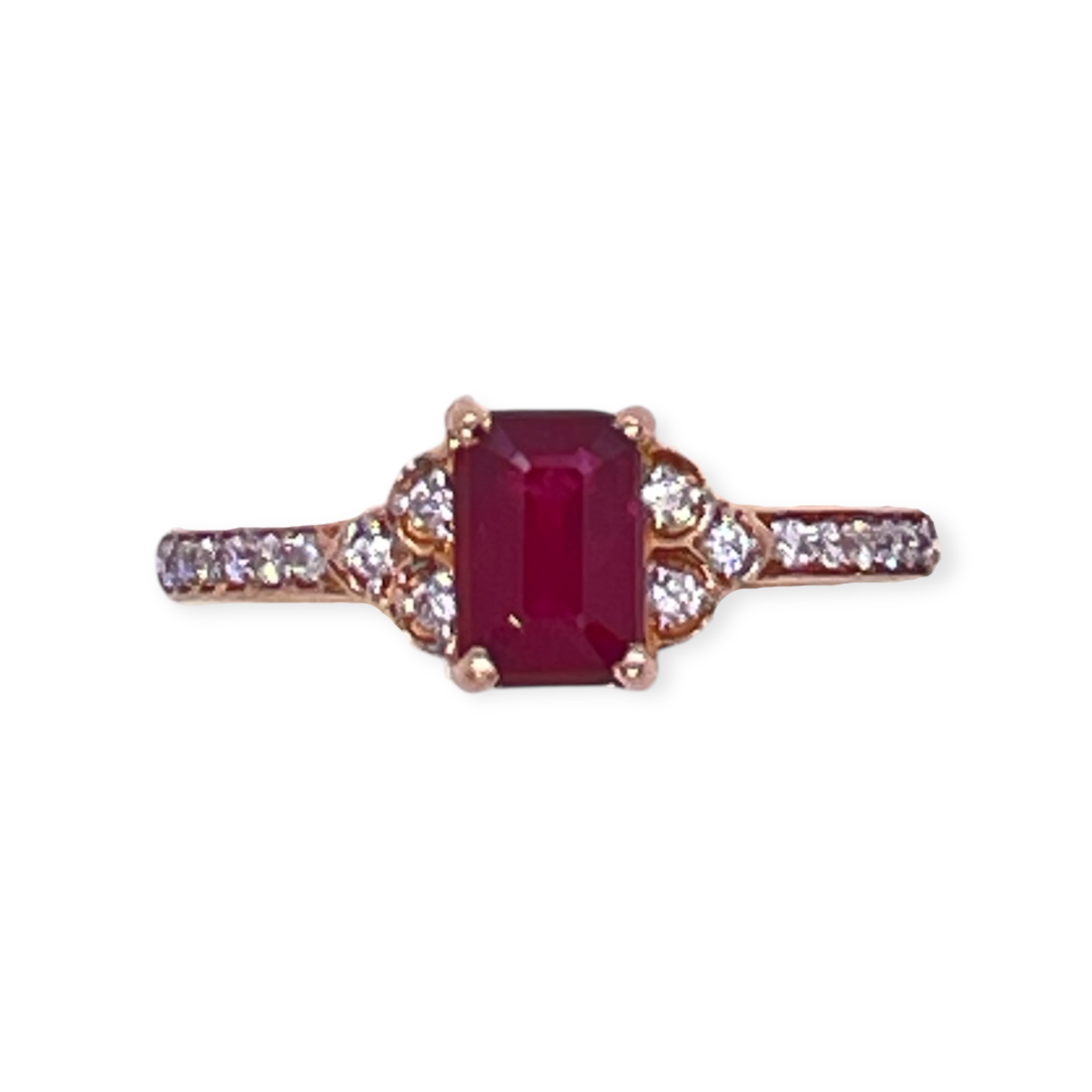A beautiful ring with an emerald cut red ruby set in 18 Kt rose gold to further increase its allure. It is complemented with natural white diamonds.