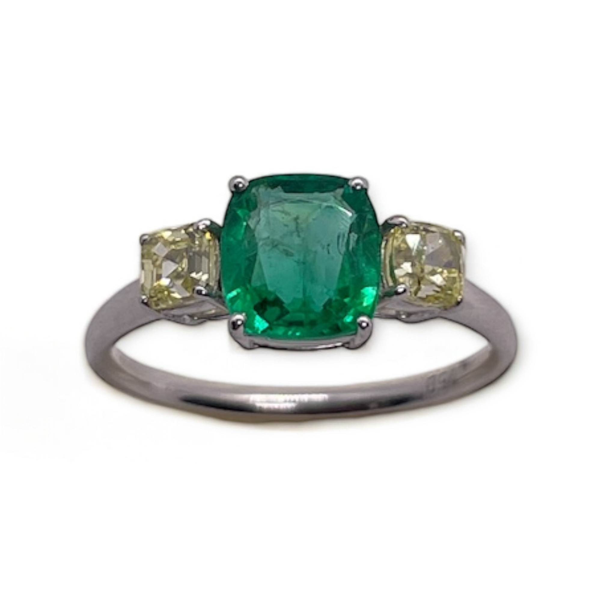 / Three Stone Emerald and Yellow Diamond ring in 18Kt White gold | A13869